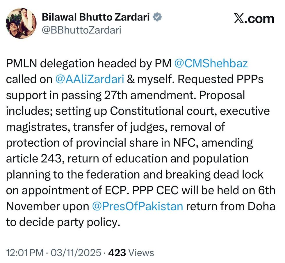 Pakistan’s former Foreign Minister Bilawal Bhutto Zardari said the government is preparing a 27th Constitutional Amendment, sparking concern it could weaken provincial autonomy guaranteed under the 18th Amendment.