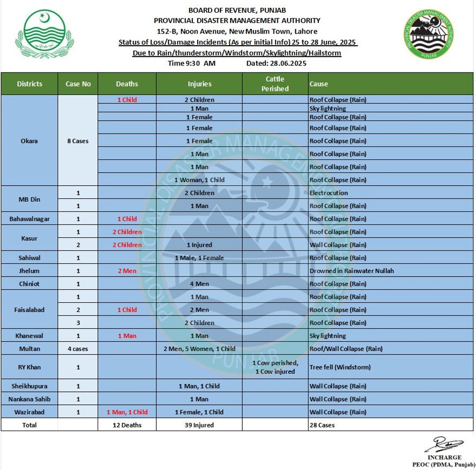 Punjab, home to more than half of Pakistan's population, reported 12 deaths and 39 injuries from building collapses as heavy rains weakened roofs and walls across rural districts. The Provincial Disaster Management Authority documented 28 separate incidents of structural failures between June 25-27.