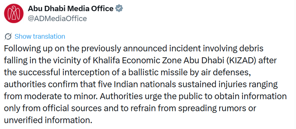 Abu Dhabi authorities report that five people were injured after debris from a intercepted missile sparked fires in the Khalifa Economic Zones – Kezad area.