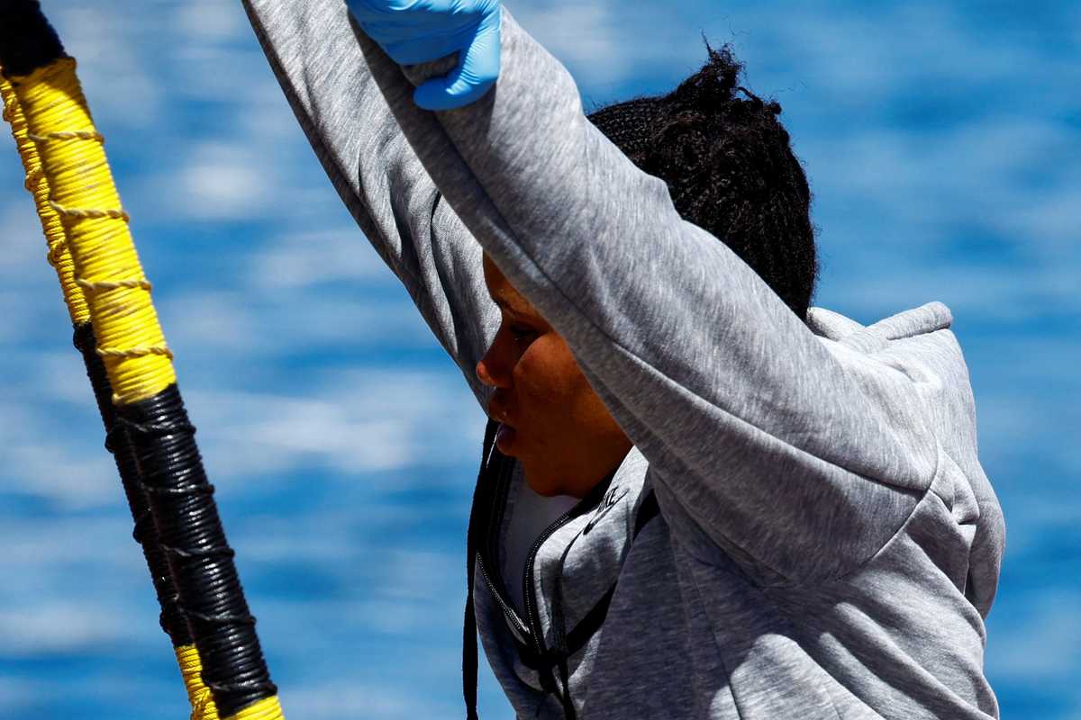 Migrants wait to disembark from a Spanish coast guard vessel, at the port of Arguineguin, on the island of Gran Canaria, Spain, September 27, 2024.