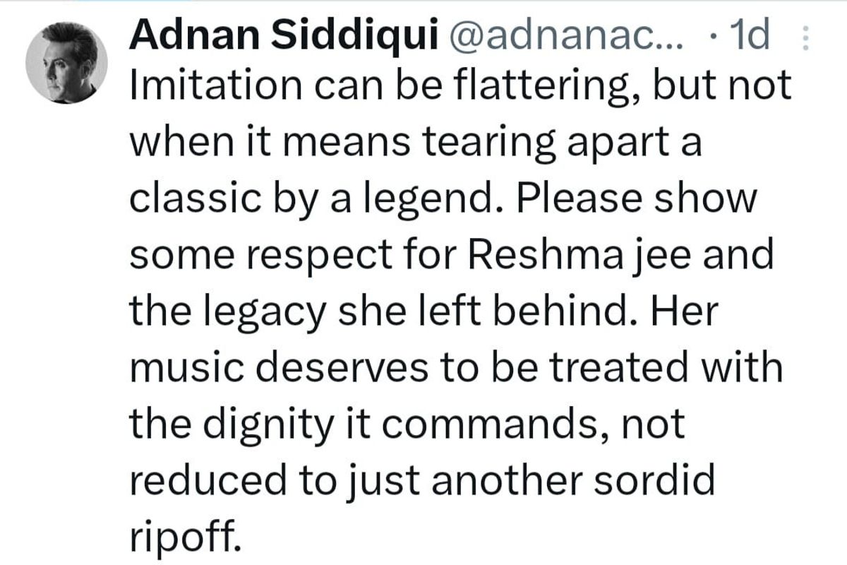 Pakistani actor Adnan Siddiqui expressed his disapproval on Instagram, stating, "Imitation can be flattering, but not when it means tearing apart a classic by a legend. Please show some respect for Reshma Jee and the legacy she left behind. Her music deserves to be treated with the dignity it commands, not reduced to just another sordid ripoff."