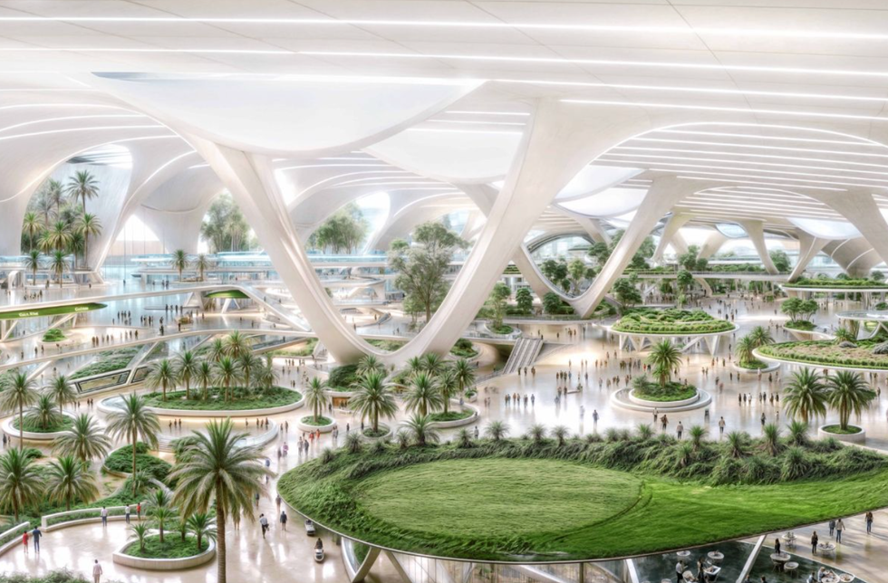 The 70-square-kilometer mega-airport will feature more than 400 aircraft gates, an automated transport network, and cutting-edge technologies such as AI, robotics, and biometric systems. Sustainability is central to the design, with a target of LEED Gold certification.