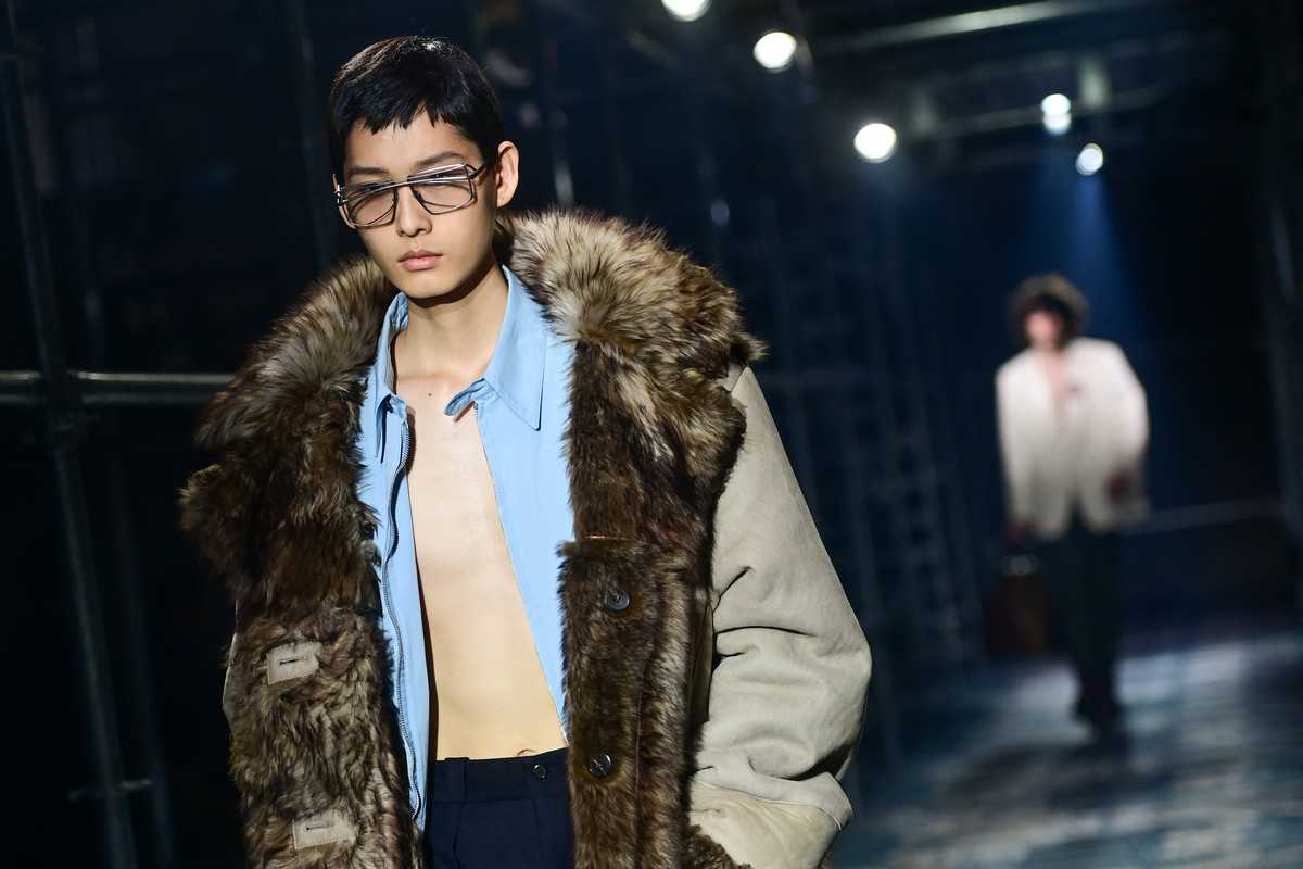 Knitted sweaters, fitted leather jackets, nylon bomber jackets, and tartan coats were among the clash of styles on a catwalk spread over three floors built out of scaffolding in the huge hall of the Prada Foundation.