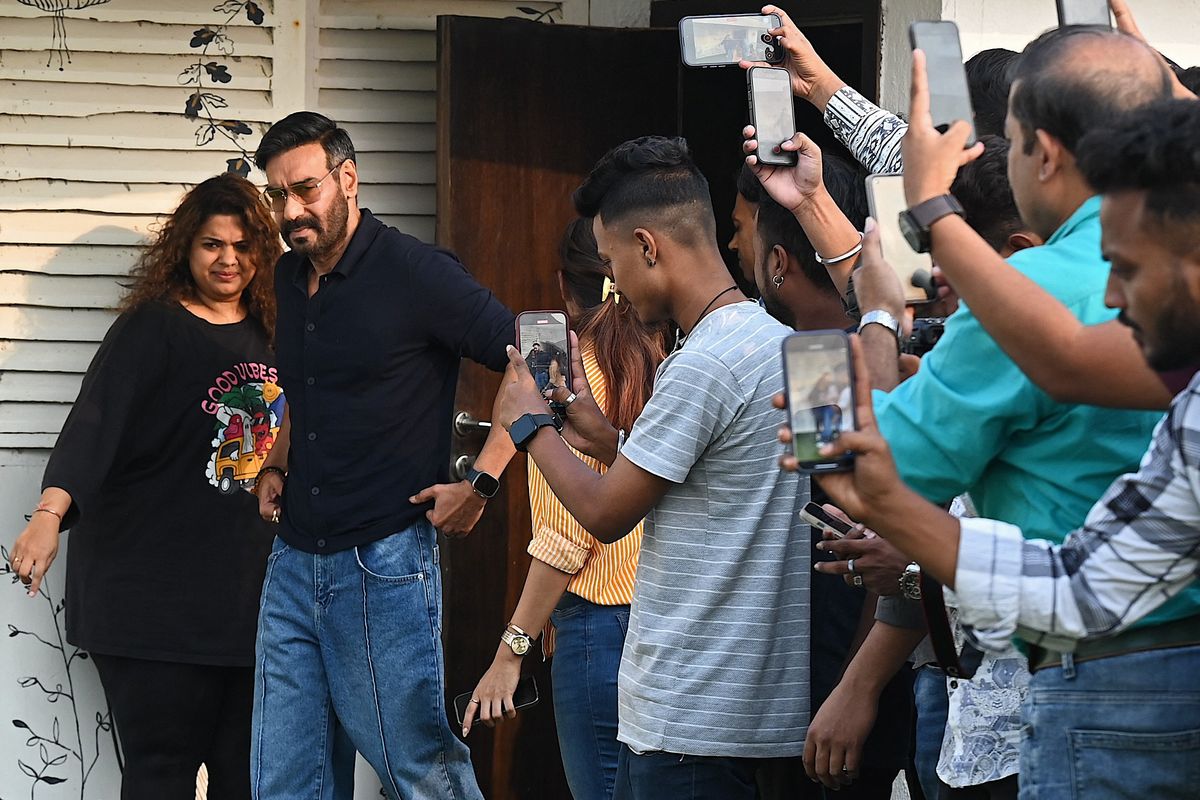 In this photograph taken on October 11, 2024, paparazzi photographers and fans take pictures and videos of Bollywood actor Amitabh Bachchan outside his residence in Mumbai.