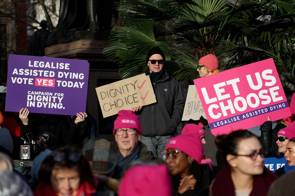 People in support of assisted dying hold placards as they gather outside the Parliament as British lawmakers debate the assisted dying law, in London, Britain, November 29, 2024.