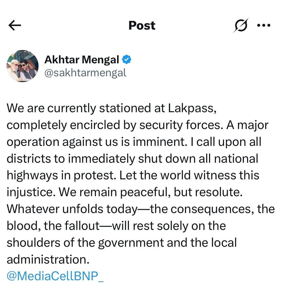 “A major operation against us is imminent. I call upon all districts to immediately shut down all national highways in protest. Let the world witness this injustice. We remain peaceful, but resolute. Whatever unfolds today—the consequences, the blood, the fallout—will rest solely on the shoulders of the government and the local administration.”