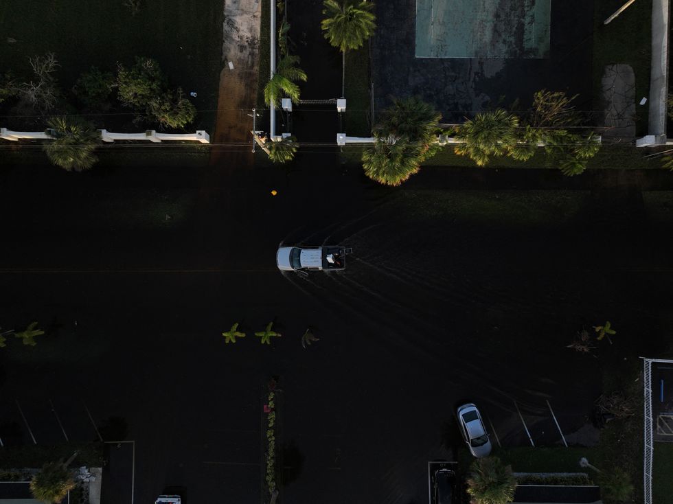 A drone view shows a car driving through a flooded street after Hurricane Milton made landfall in South Daytona, Florida, U.S., October 11, 2024.