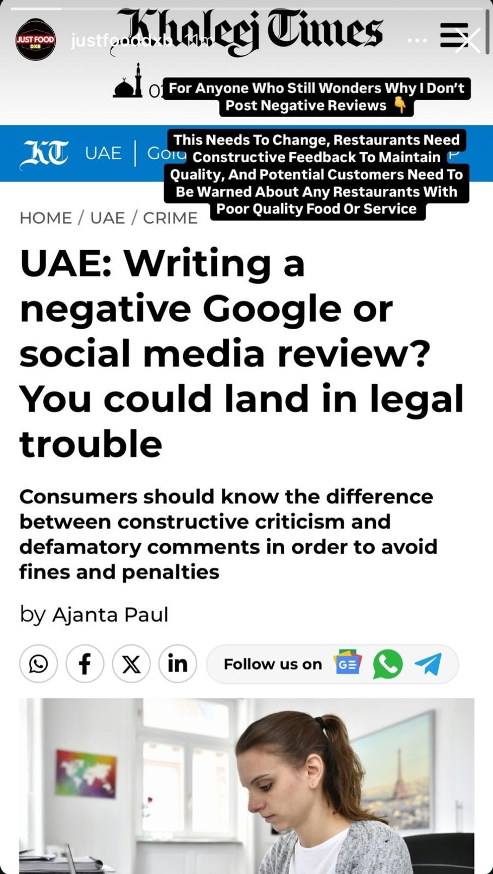 One of the most popular food bloggers, justfooddxb reposted the article, stating, “For anyone who still wonders why I don’t post negative reviews.”
