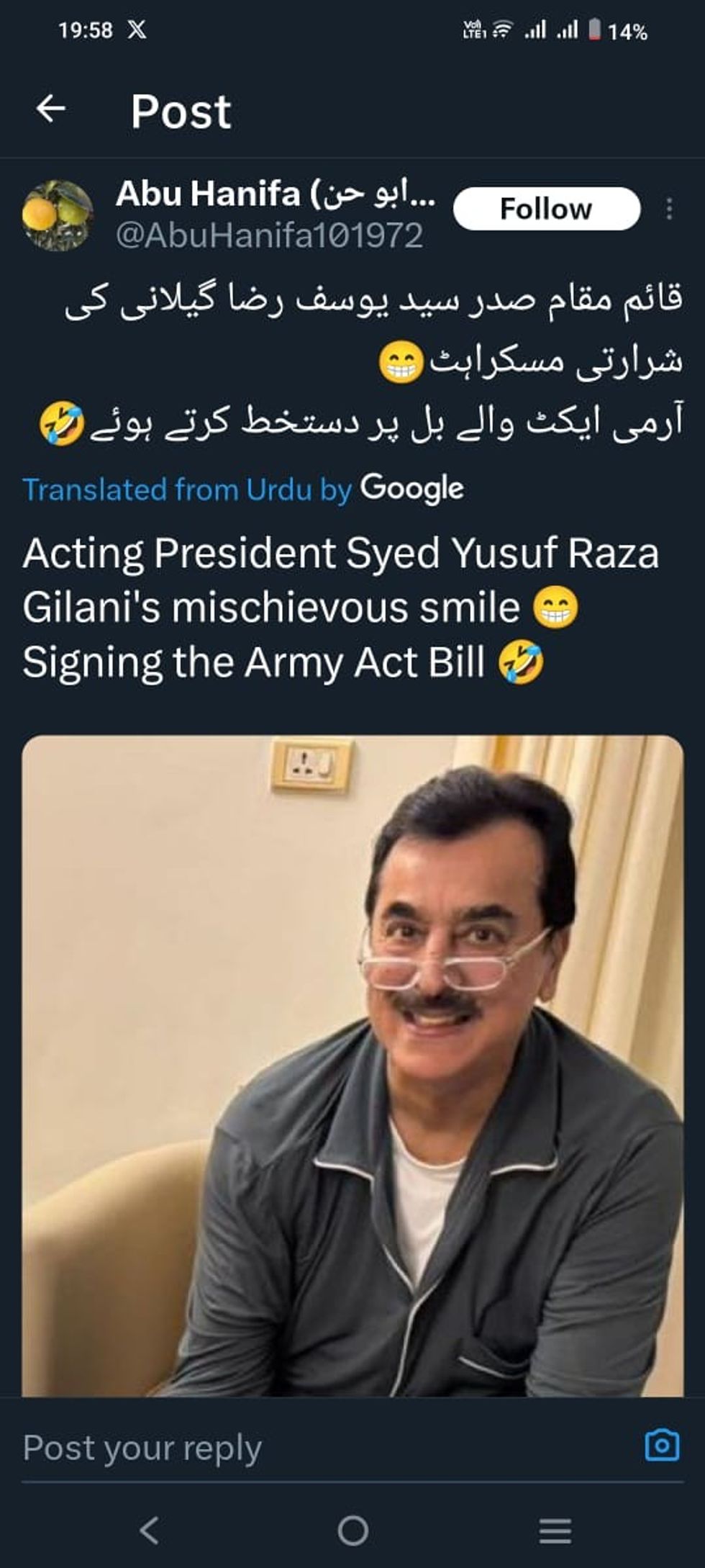 Another said, "Acting President Yousuf Raza Gilani's mischievous smile [while] signing the Army Act Bill."