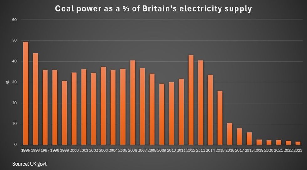 Coal's contribution to Britain's electricity has fallen from nearly 30% in 2015 to just over 1% last year