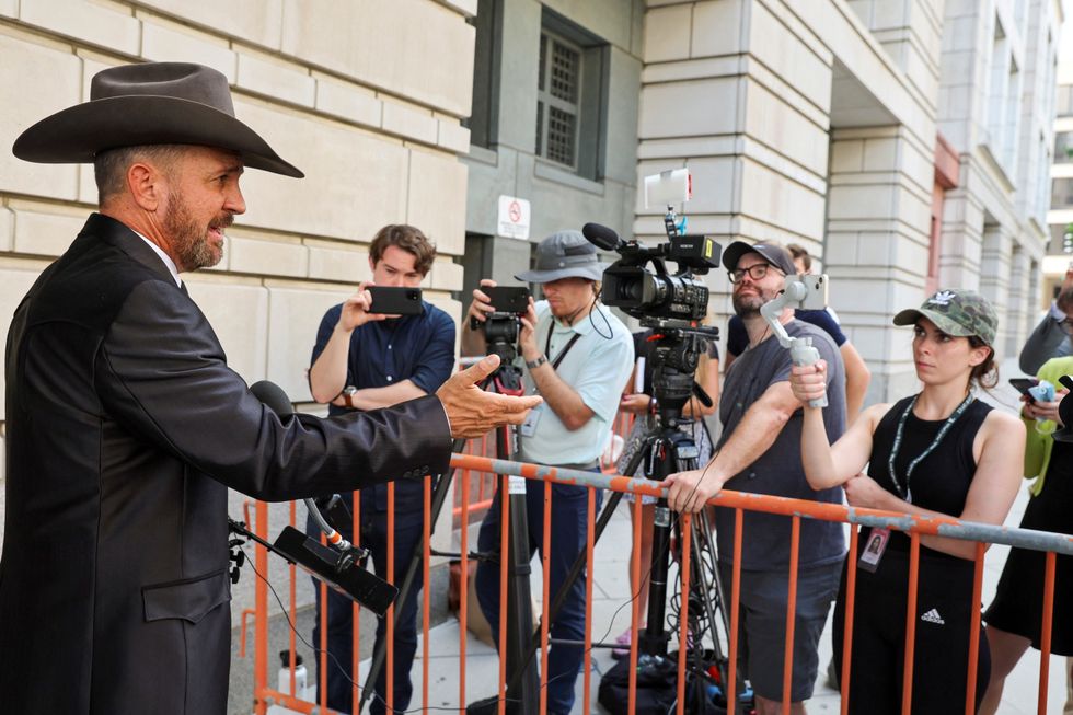 Couy Griffin founder of "Cowboys for Trump" organization and commissioner of Otero County, New Mexico speaks to media after leaving federal court in Washington, U.S., June 17, 2022.
