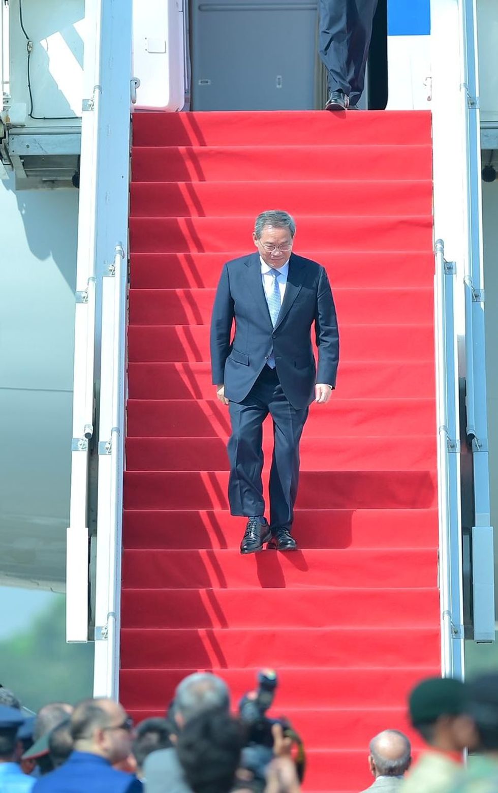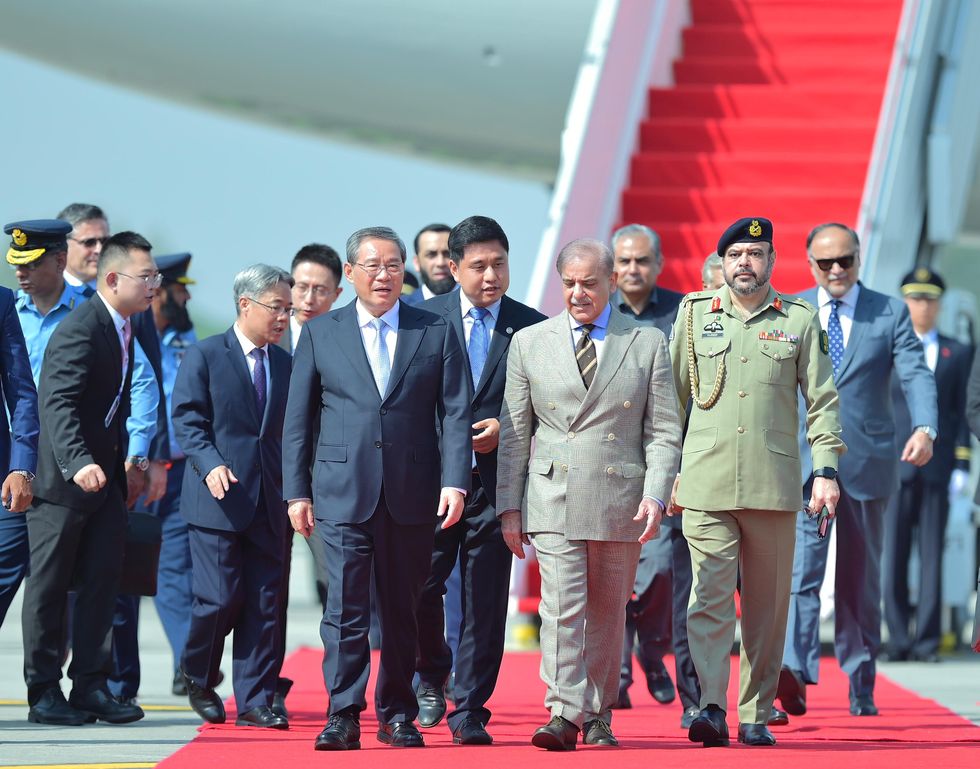 Premier Li was welcomed by Pakistani Prime Minister Shehbaz Sharif at Noor Khan Air Base with a red carpet reception.