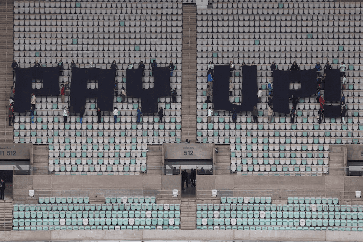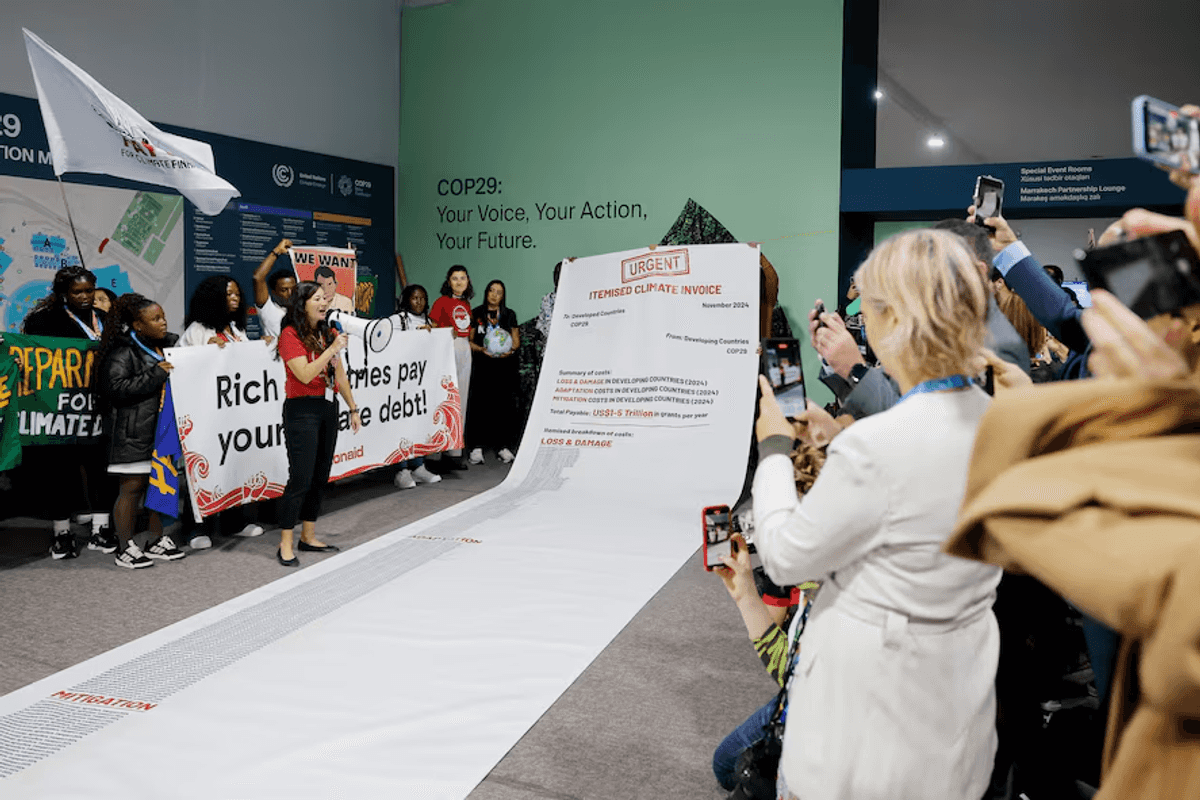 An activist holds up a sign at a protest during the United Nations Climate Change Conference (COP29), in Baku, Azerbaijan November 14, 2024.