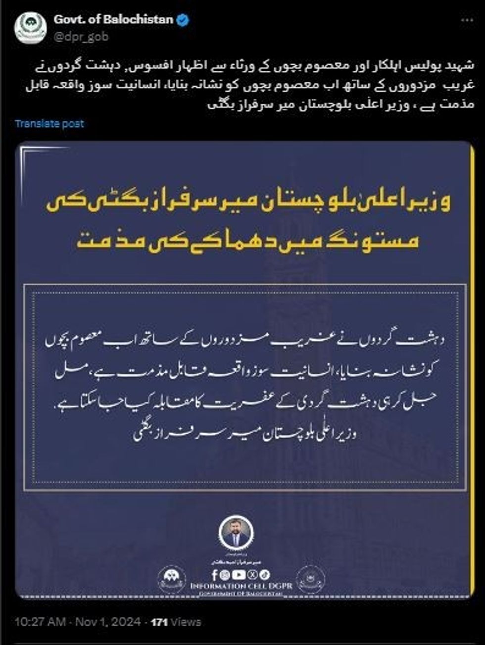 in Balochistan’s Panjgur district. The outlawed Baloch Liberation Army (BLA), one of the most prominent separatist groups, claimed responsibility for this attack, along with two other killings in Kech and Quetta districts.