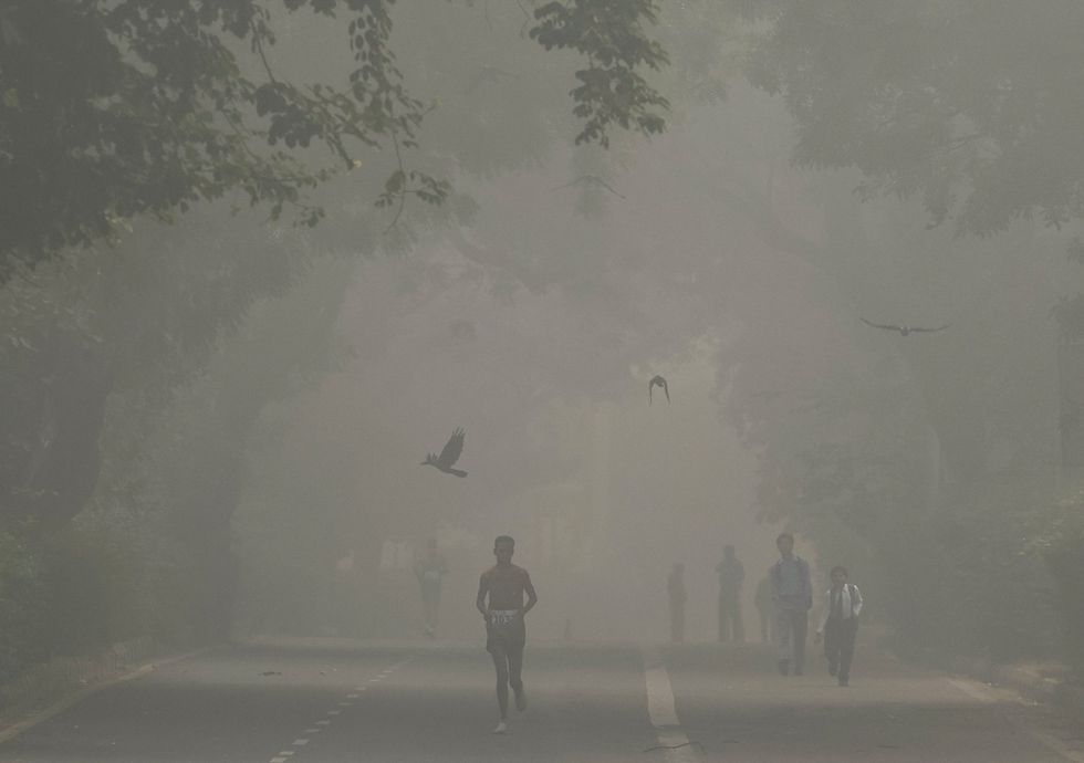 Men play badminton at Lodhi Garden while the sky is enveloped with smog in Delhi
