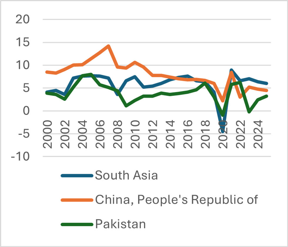 The first is real GDP growth: Pakistan’s inflation-adjusted growth rate is trailing the South Asian average by a significant margin. GDP growth has remained volatile during CPEC as it was in the pre-CPEC time.
