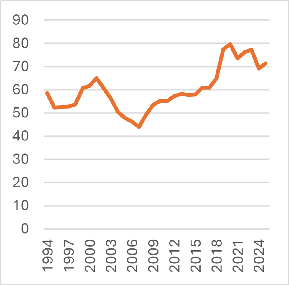 The third chart is the most important: government debt as a fraction of GDP has risen noticeably in the last few years, witnessing a spike since 2015. This gives credence to claims made at the start of CPEC that it is a Chinese neo-imperialist design to indebt Pakistan and use debt as a political instrument.