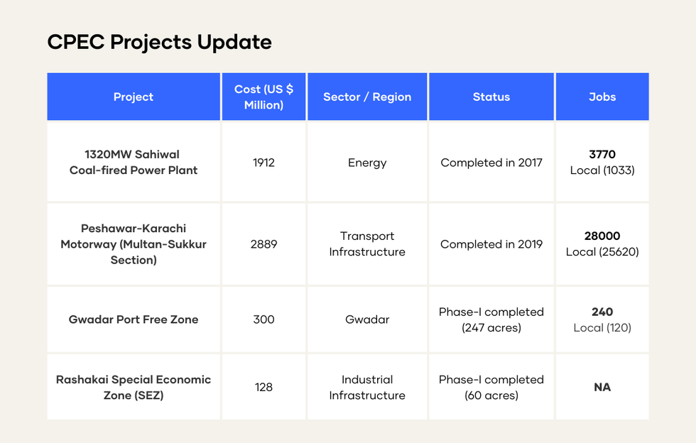 I have selected the largest CPEC project from each of the four sectors marked for implementation by the Planning Commission of Pakistan. These four collectively claim around $5 billion of CPEC investment and seek to generate around 27,000 local jobs in the economy.