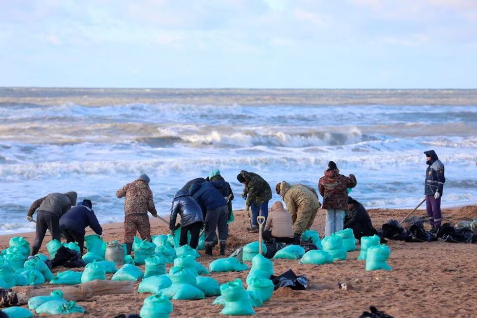 Workers clear spilled oil on the coastline following an incident involving two tankers damaged in a storm in the Kerch Strait, Russia December 21, 2024.