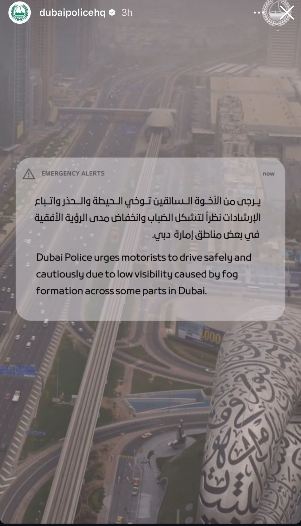Dubai Police issued an urgent safety alert Tuesday morning as a thick fog blanketed large parts of the city, significantly reducing visibility. The dense fog prompted Authorities to lower speed limits to 80 km/h on several major roads.