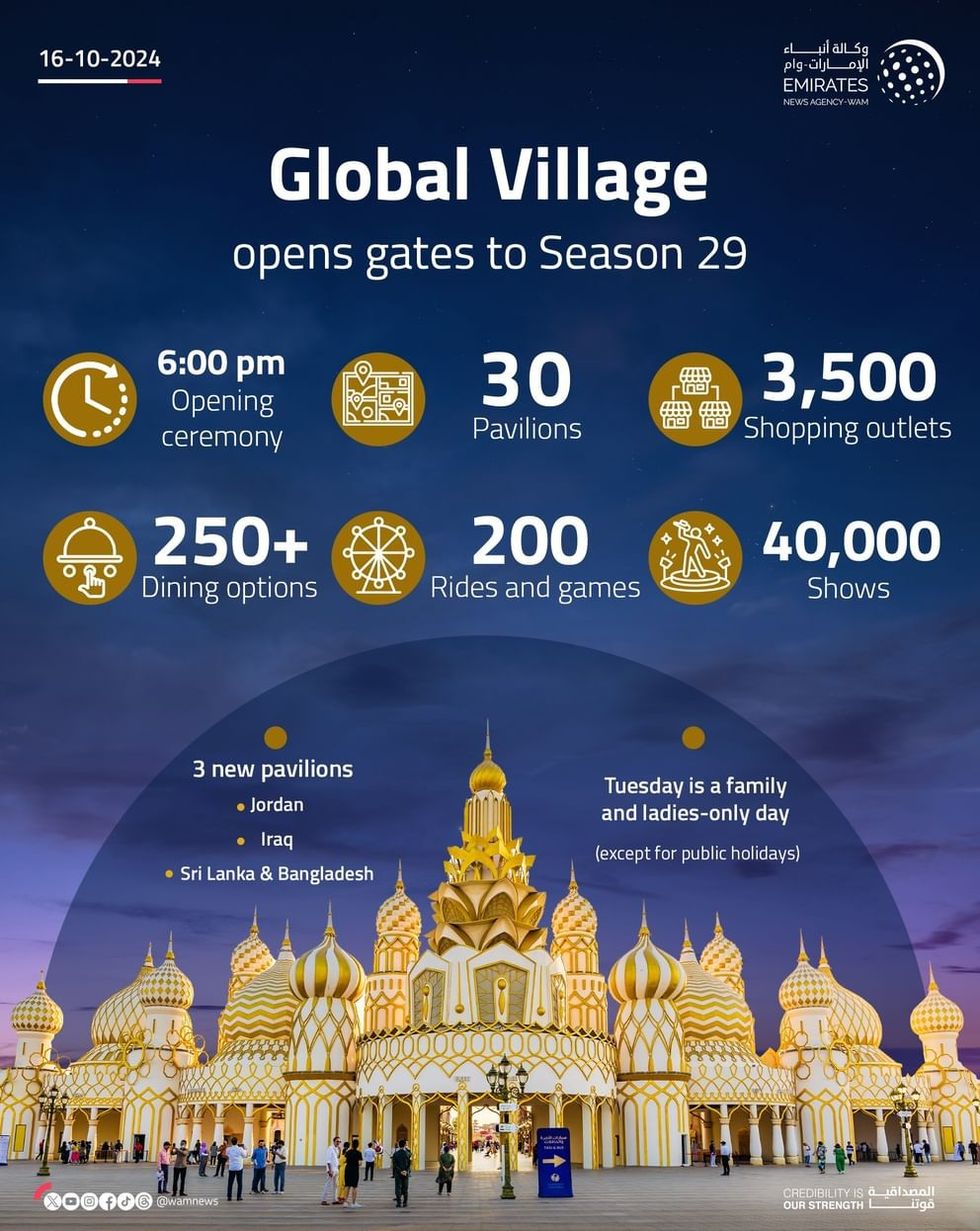 Tickets are now on sale for the season and can be purchased through the Global Village official website, mobile app, or at the ticket counters at the gates. Prices remain unchanged: the Any Day ticket is AED 30, and the Weekday ticket is AED 25.
