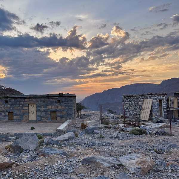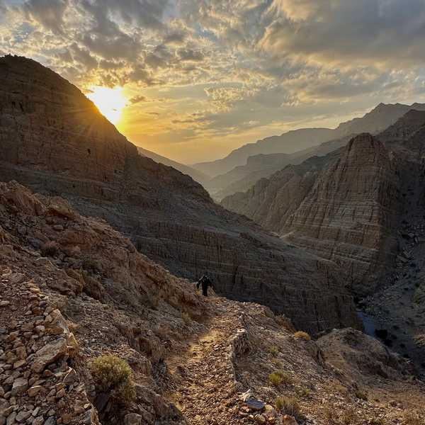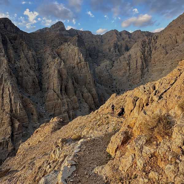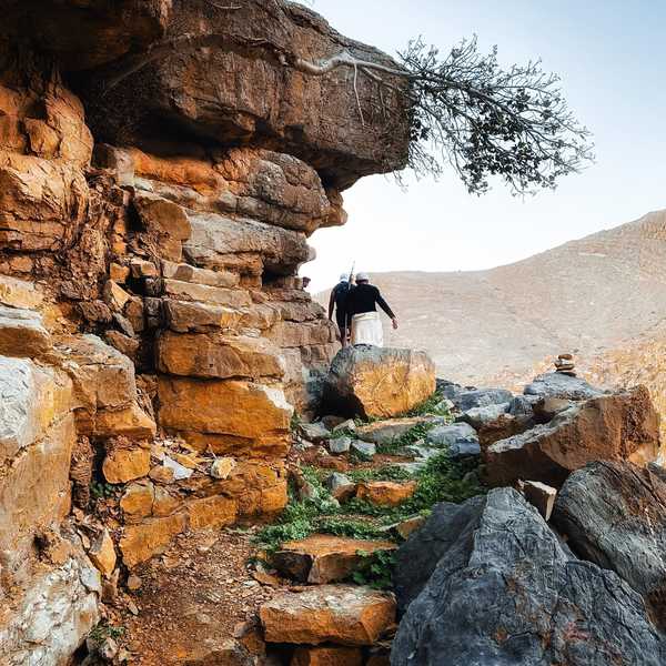 The trail walks through a spectacular landscape, surrounded by vibrant orange cliffs and dramatic rock formations, offering plenty of photo opportunities. You'll hike up to the remote Sheri Village, perched at 800 meters, where you'll be rewarded with amazing views of the Hajar Mountains.