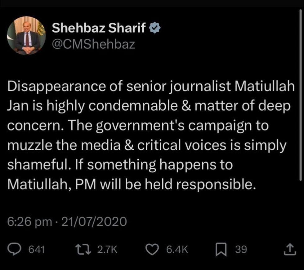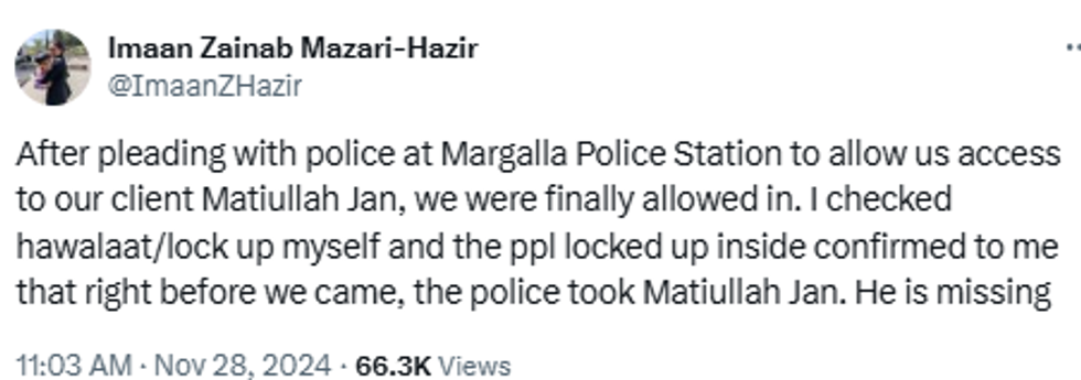 "My father’s so-called 'issue' is that he insists on reporting from the field and presenting the facts directly to the public. For this reason, these unidentified individuals—who consider themselves the true custodians of Pakistan—took him away," he said.