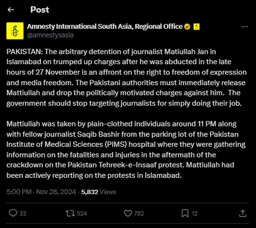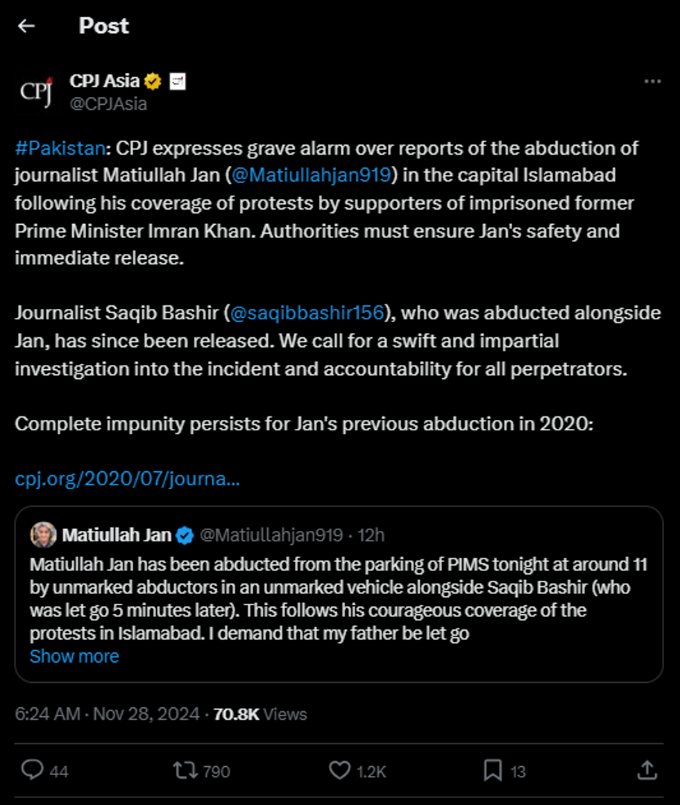 All three organizations connected Jan's abduction to his coverage of recent protests by supporters of imprisoned former Prime Minister Imran Khan, suggesting a pattern of intimidation against journalists covering political dissent in Pakistan.