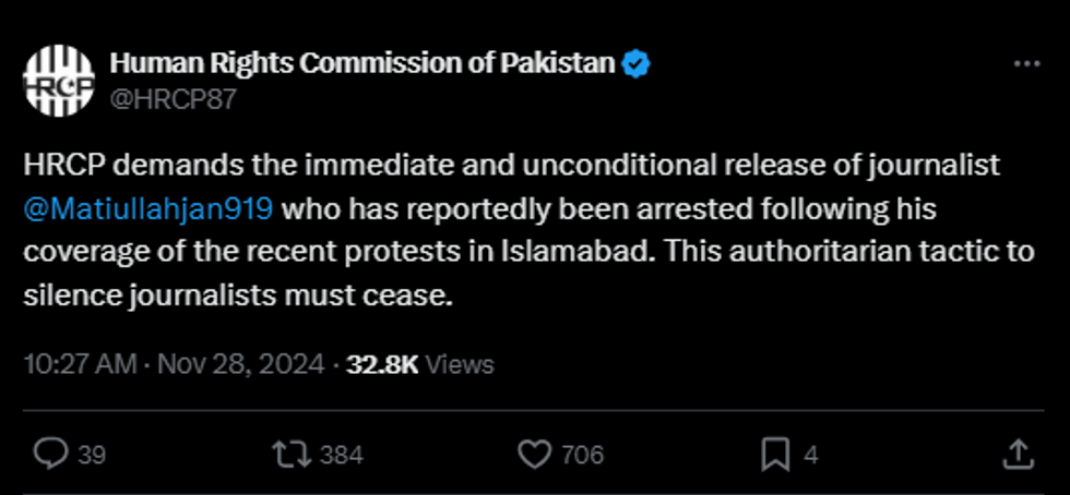 The Human Rights Commission of Pakistan (HRCP) also demanded Jan's "immediate and unconditional release," characterizing his arrest as an "authoritarian tactic to silence journalists."