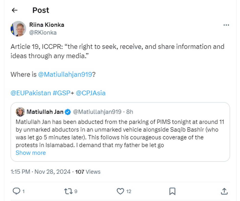 European Union Ambassador to Pakistan, Riina Kionka, has called for clarity regarding the disappearance of journalist Matiullah Jan.