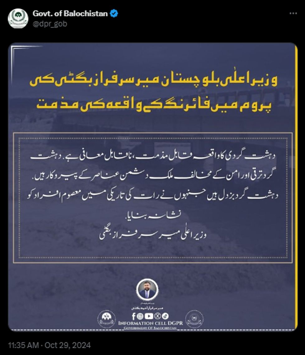 Balochistan Chief Minister Mir Sarfraz Bugti condemned the attack in statement issued by the Balochistan Provincial Government in a social media post Tuesday morning.