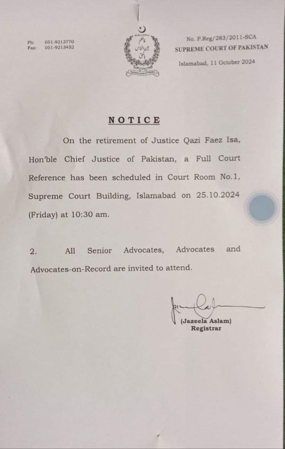 Pakistan's Supreme Court (SC) issued a notice for a full court reference on October 25, 2024, at 10:30 AM. to honor the outgoing chief justice, Qazi Faez Isa.