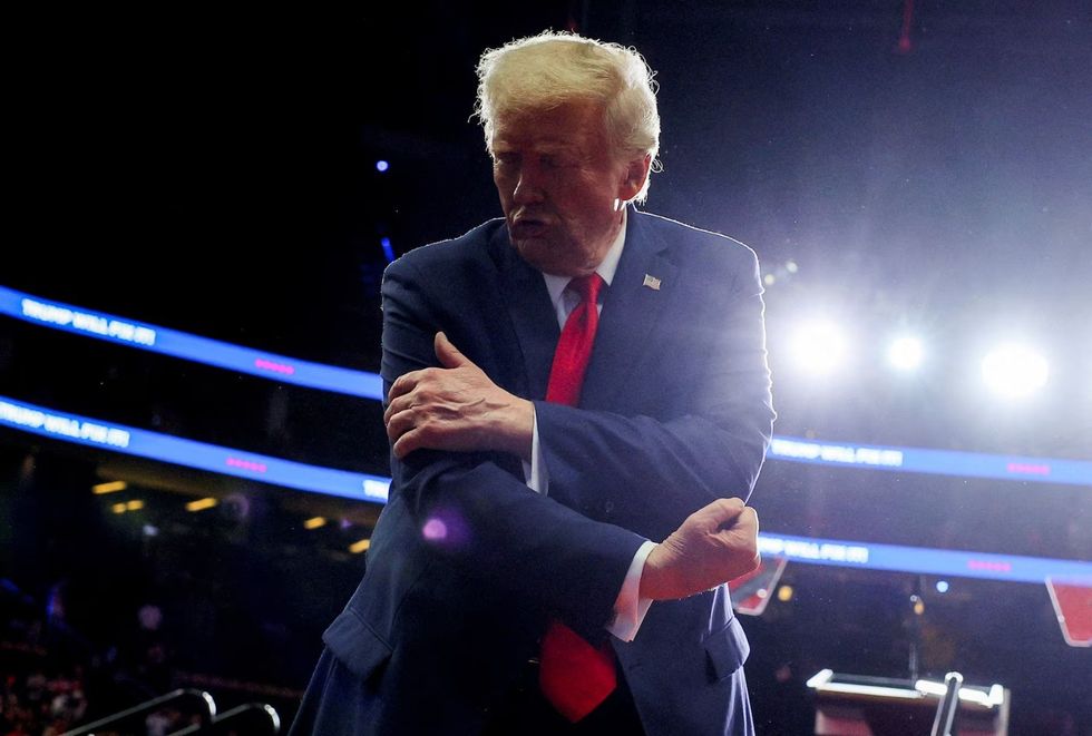 Republican presidential nominee and former U.S. President Donald Trump takes the stage to address supporters at his rally, at the Palm Beach County Convention Center in West Palm Beach, Florida, U.S., November 6, 2024.