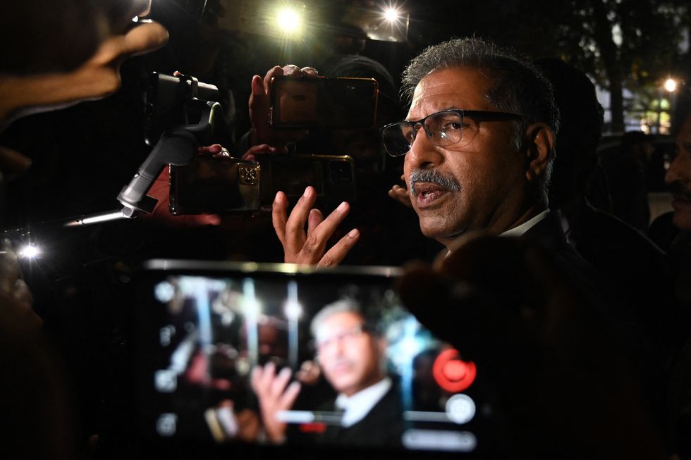 Pakistan Tehreek-e-Insaf (PTI) party's chief Gohar Khan (3rd R) and legal team members speak to media outside the Supreme Court building after the election symbol verdict in Islamabad on January 13, 2024.