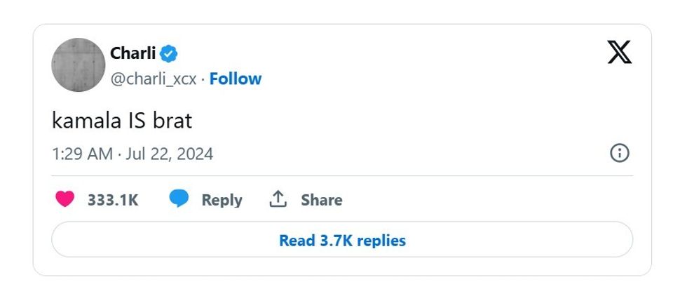Despite her British origins, pop artist/DJ Charli XCX helped Kamala Harris gain traction with Gen Z fold by tweeting "kamala IS brat," an endorsement that Harris' team was quick to acknowledge by changing the display photo on her X account to the “brat” green color. They also used the same font from Charli's album of the same name.