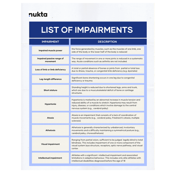 Given the vast variety of disabilities, para athletes are divided into different impairment groups. There are currently 10 eligible impairment groups recognized by the IPC; eight of them are based on physical disabilities, while the remaining ones are vision and intellectual based each.