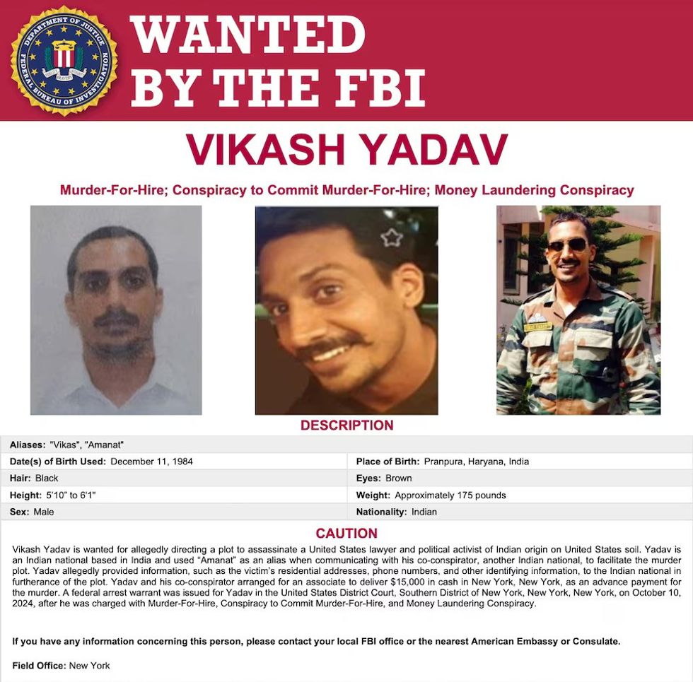 The U.S. Justice Department unsealed the indictment of Vikash Yadav, 39, on Thursday, alleging he led a plot to murder a Sikh separatist in New York.