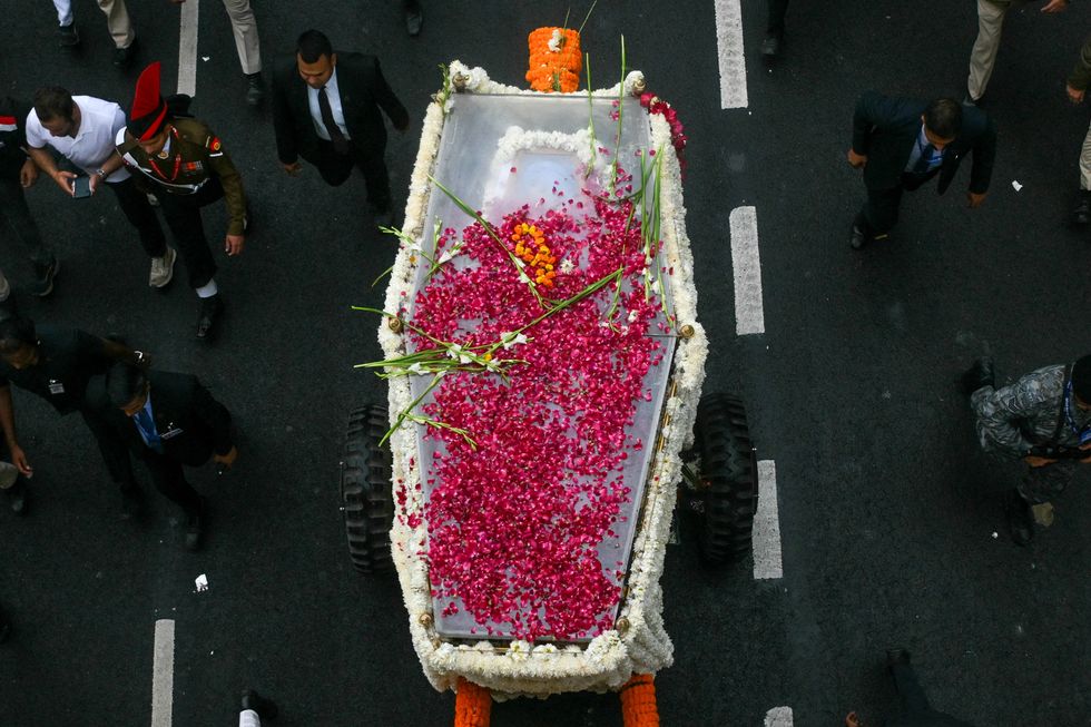 Coffin was draped in garlands of flowers in the colours of India's flag