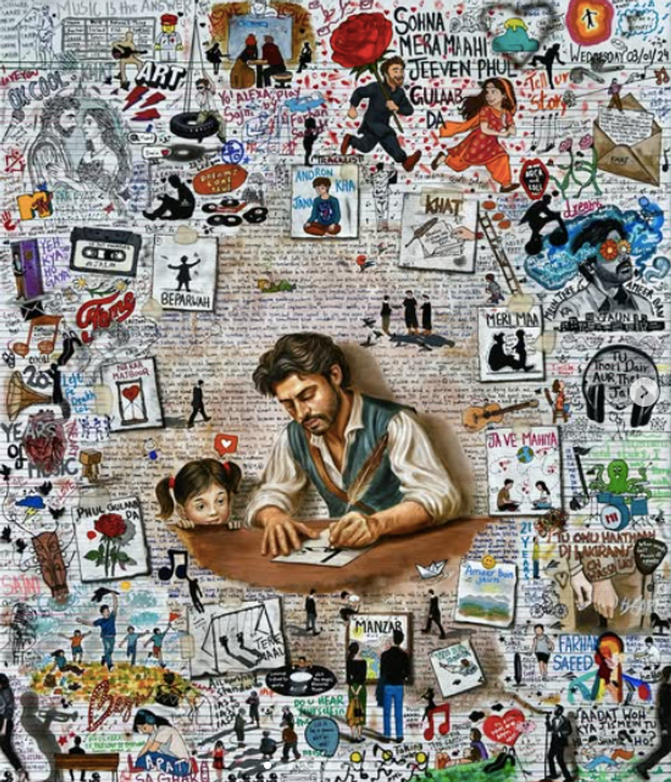 He further shared that the visual identity of the album is equally personal and perhaps the most fascinating part of Khat. An intricate, hand-painted piece filled with hidden symbols from Farhan’s life. Created by Islamabad-based artist Umair Fayyaz, the piece is filled with timestamps, song titles, and even a small self-portrait of Farhan as an eight-year-old dreaming of becoming a singer. “No one has ever done an album cover like this,” he said proudly. He also added that ever since the birth of his daughter Jahan Aara, “music came back into my life”.