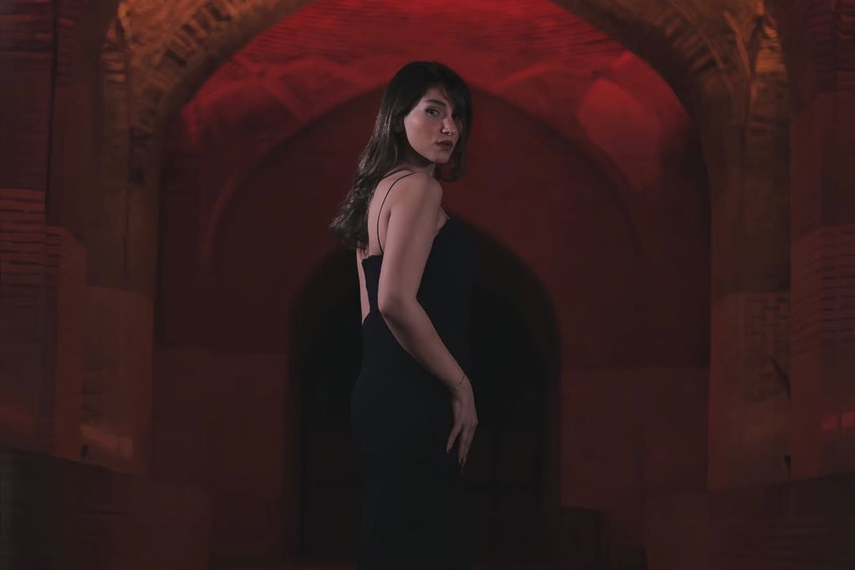 Parastoo Ahmadi wore no headscarf and was bare-shouldered in a long, flowing black dress during her online concert