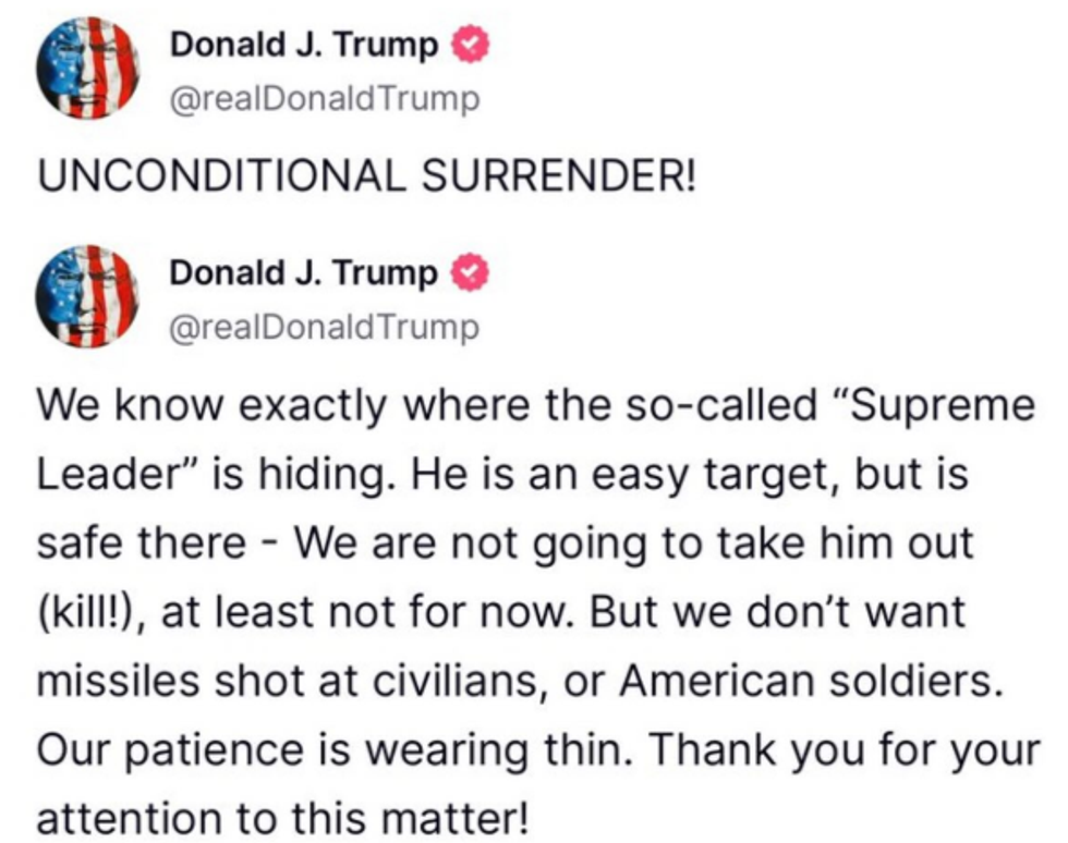 He also claimed Iran had reached out for negotiations but doubled down: “My patience has already run out… we are demanding unconditional surrender.”