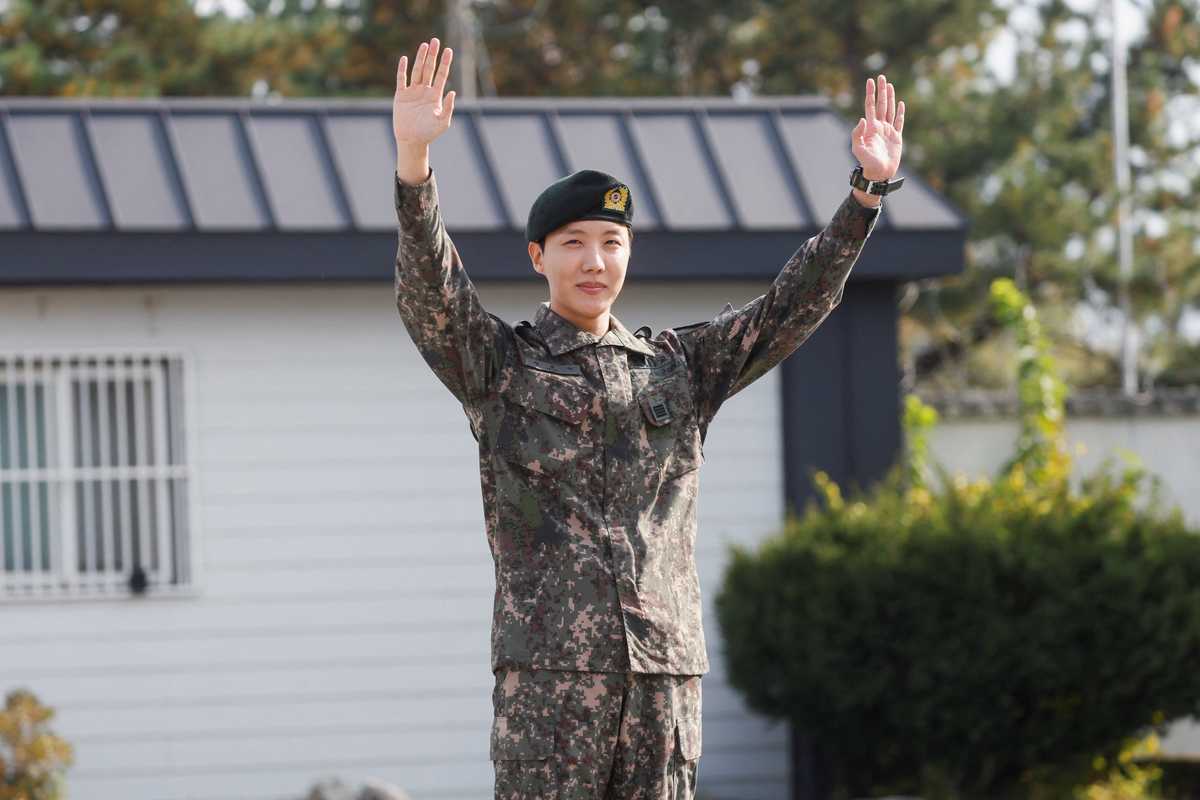 Wearing a uniform and a black beret, J-Hope smiled as he greeted Jin and around 100 cheering fans as well as reporters upon his release at a military base in Wonju, Gangwon province.