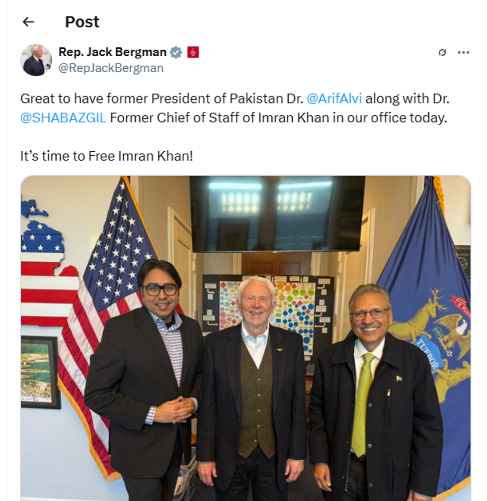 Congressman Jack Bergman has previously expressed support for Imran Khan, tweeting “Free Imran Khan” in January. He also met PTI figures like former President Dr. Arif Alvi and Shahbaz Gill earlier this year.