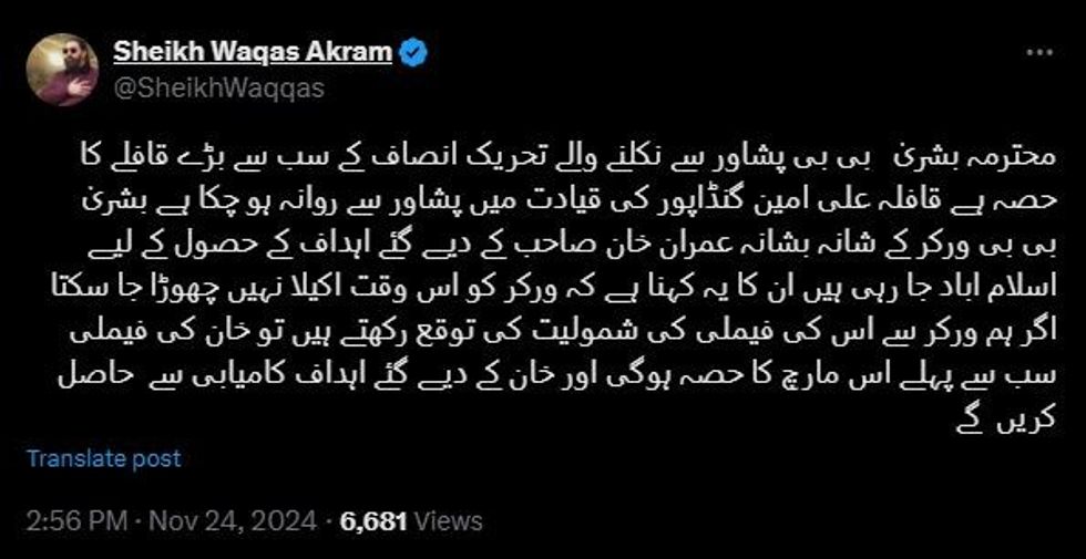 Khan's wife, Bushra Bibi, and Khyber Pakhtunkhwa CM Ali Amin Gandapur are leading PTI convoys of protesters marching toward capital to demand release of former prime minister