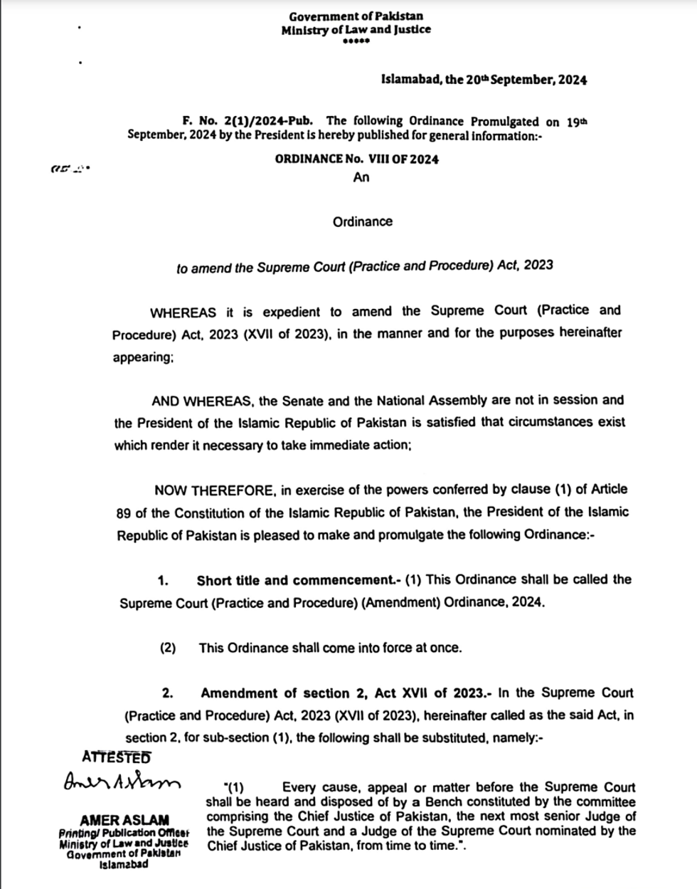 In less than 24 hours, Pakistan's federal government amended key Supreme-Court related legislation through an ordinance, which President Asif Ali Zardari signed into law, and the Supreme Court ordered the replacement of a dissenting judge in the judge's committee.