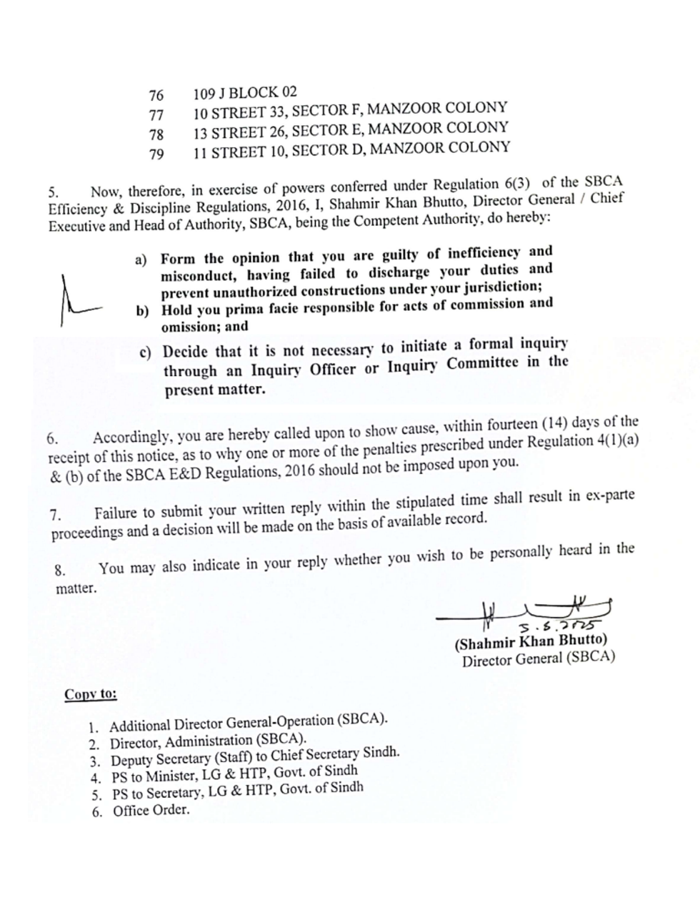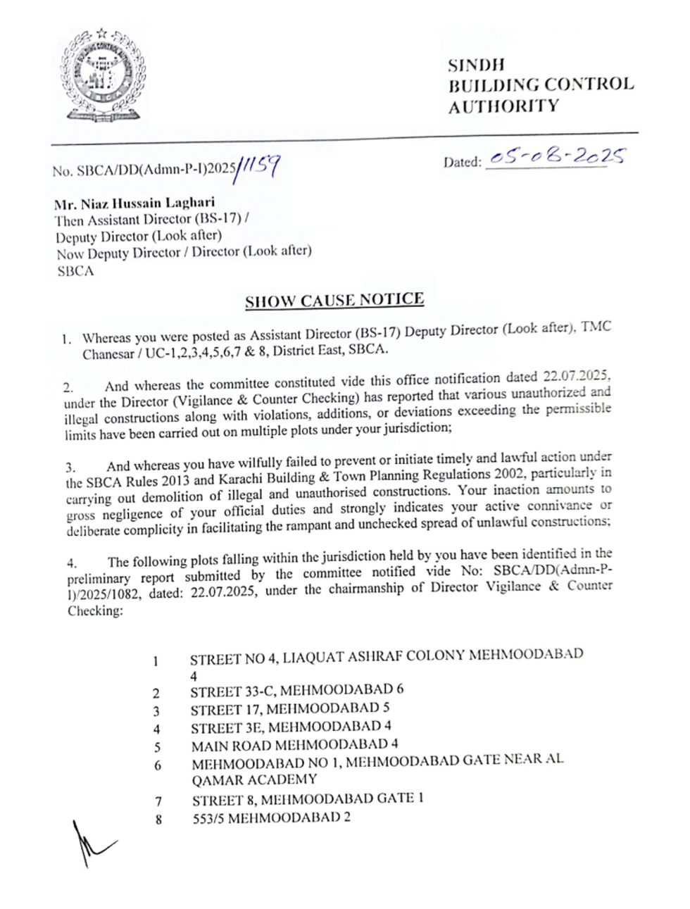 Among those served notices is Niaz Hussain Laghari, the current Director of Building Control for East Karachi, who is accused of allowing 79 illegal constructions in his jurisdiction, according to a show cause notice dated Aug. 5, 2025.