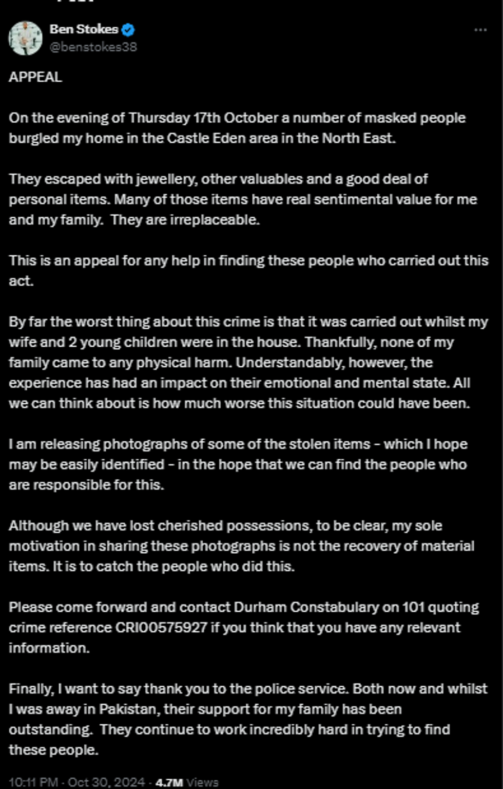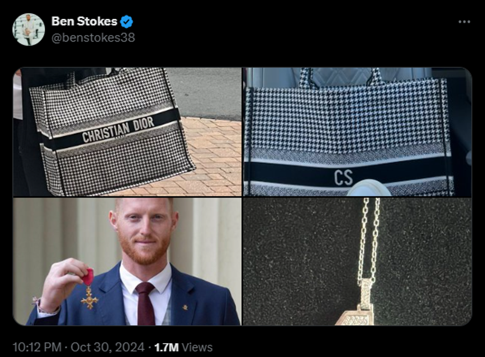 Describing the break-in on his personal X account, Stokes posted images of the items taken from his home including a Christian Dior handbag, a gold ring with England cricket insignia and bracelets.