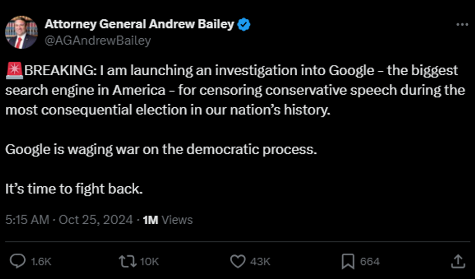"I am launching an investigation into Google - the biggest search engine in America - for censoring conservative speech during the most consequential election in our nation’s history," Bailey said in a post on social media platform X.
