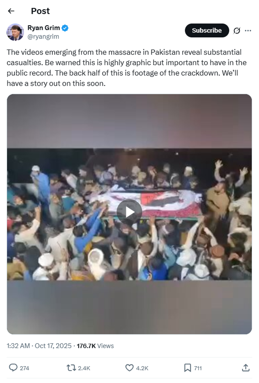 Soon after, Drop Site News published an article alleging that the crackdown had resulted in a “massacre” in Muridke. The piece, authored by U.S.-based journalist Ryan Grim, relied on anonymous accounts and an unverified video compilation as its primary evidence.