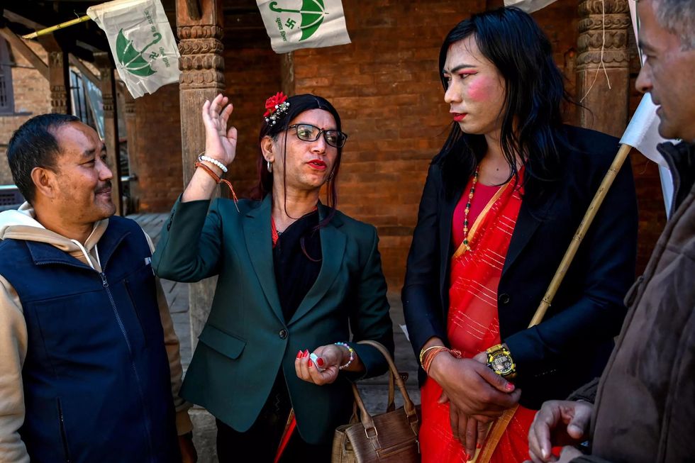 In this picture taken on November 20, 2024, transgender candidates from the Janata Samajwadi Party-Nepal Deepak Maharjan (2R), officially known as Honey, and Mouni Maharjan (R) officially named Rajeev, gesture during an election campaign ahead of the upcoming local by-election in Kirtipur, on the outskirts of Kathmandu.